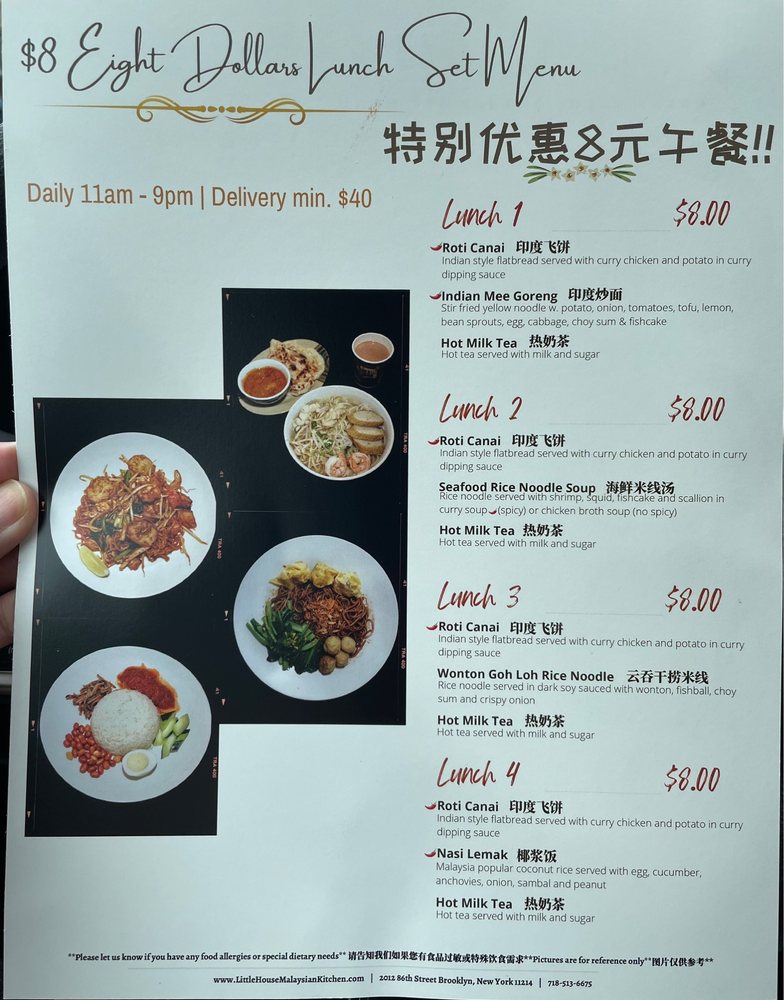 Little House Malaysian Kitchen located at 2012 86th St in Brooklyn, NY offers a trendy dining experience with catering and waiter service. The menu features house specialties like Satay Chicken and Satay Beef skewers, Braised Pork Belly with Yam, and Curry Mee Young Tao Fu. Customers rave about the delicious curry dishes and Malaysian desserts available for purchase. The cozy atmosphere and friendly service make this spot a go-to for Malaysian cuisine. Standout dishes include the Claypot Fish Curry and the Chow Kueh Teow, offering a range of flavors and textures that leave a lasting impression. Don't miss out on the unique dishes and comforting flavors at Little House Malaysian Kitchen.
